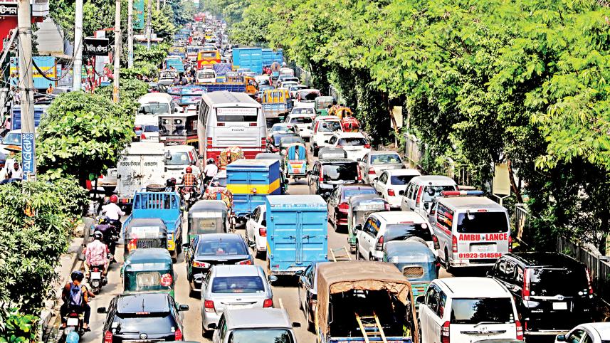 A long tailback clogs a road in the Tejgaon area of the capital, leaving commuters stuck for hours. Multiple ongoing protests across the city caused the heavy traffic congestion. The photo was taken yesterday. Photo: Anisur Rahman