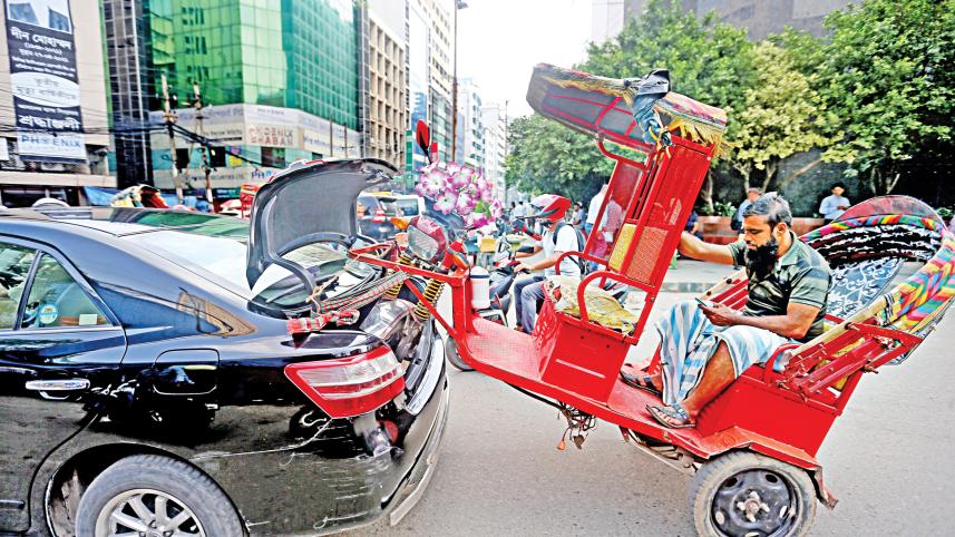 After this battery-run auto-rickshaw hit the car, the rickshaw driver failed to pay compensation on the spot. The car driver then took an unusual step -- towing the rickshaw to the back of his car and driving off to find its owner for compensation. The photo was taken on Rajuk Avenue in the capital yesterday. Photo: Firoz Ahmed