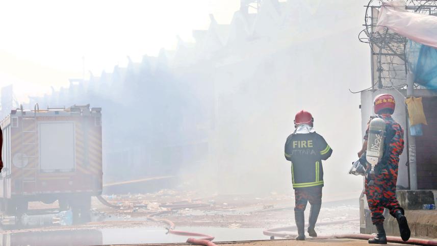 Firefighters continued working yesterday at the site of a blaze that destroyed the import section of Hazrat Shahjalal International Airport’s cargo village in the capital on Saturday. Photo: Palash Khan