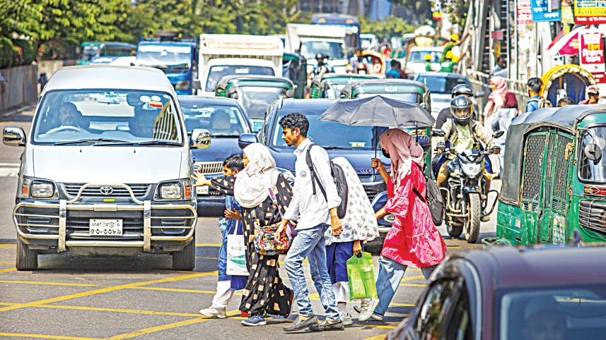 A woman, her children, and others jaywalk across the busy Kazi Nazrul Islam Avenue in the capital’s Farmgate area between two nearby footbridges and two zebra crossings. The risky move, photographed yesterday, exposed them to the dangers of a fatal accident. Photo: Rashed Shumon