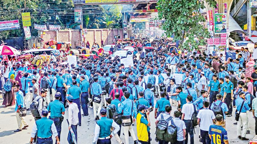 Students of Government Science College in Tejgaon stage a protest at Farmgate in the capital yesterday, demanding the removal of illegal shops and rickshaw stands occupying the road and footpath near their institution to ensure safe and congestion-free movement for both students and commuters. Photo: Rashed Shumon