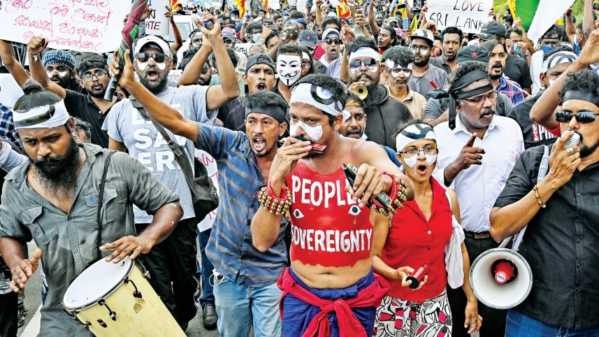 Men and women poured onto Colombo's seafront promenade and laid siege to the colonial-era Presidential Secretariat, chanting "Go home Gota" and waving the national lion flag.