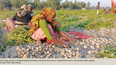 Potato farmers in five northern districts -- Lalmonirhat, Kurigram, Gaibandha, Rangpur, and Nilphamari -- in the Rangpur region are seeing a bumper yield of the early variety potatoes due to favourable weather conditions.