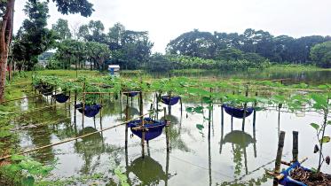 Growing vegetables on hanging beds made of bamboo, nets and polythene has turned out to be a boon for farmers under two low-lying unions in Fakirhat upazila.