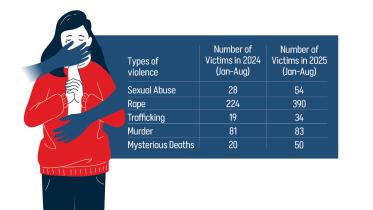 At least 54 girls were sexually harassed or abused, and 390 others were raped or gang-raped in the first eight months of this year, according to a report by the National Girl Child Advocacy Forum (NGCAF).