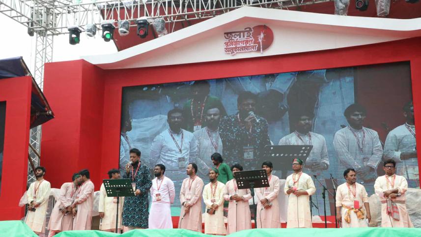 Performers on stage during the opening session of the ‘36 July Celebration’ at Manik Mia Avenue. Photo: Palash Khan