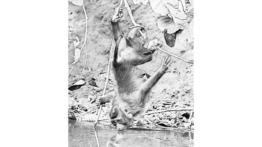 At a pond in Satchori, I observed groups of Pig-tailed Macaques as they came to drink water. They drank in two styles. Most of them crouched low to reach the water. But young athletic ones preferred to hang upside down from overhanging branches to reach the water. Groups sometimes broke out in fights, usually more violent than the one I observed from the tower.