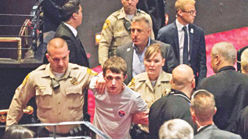 Video of his arrest carried by US media show a skinny man with short brown hair and a grey T-shirt being quickly escorted out of the rally by police officers with his hands behind his back.