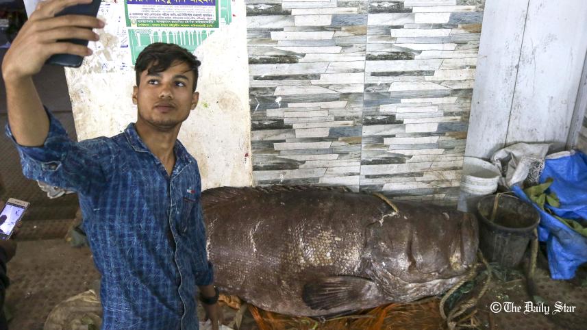 A young man takes a quick selfie with this enormous tripletail, locally known as "koikoral", weighing 220kg and caught from Cox's Bazar. The fisherman is planning on selling the fish for Tk 1,200 per kg at port city's Kazir Deuri Bazar today. This photo was taken on February 5, 2020 from the bazaar. Photo: STAR/ Rajib Raihan