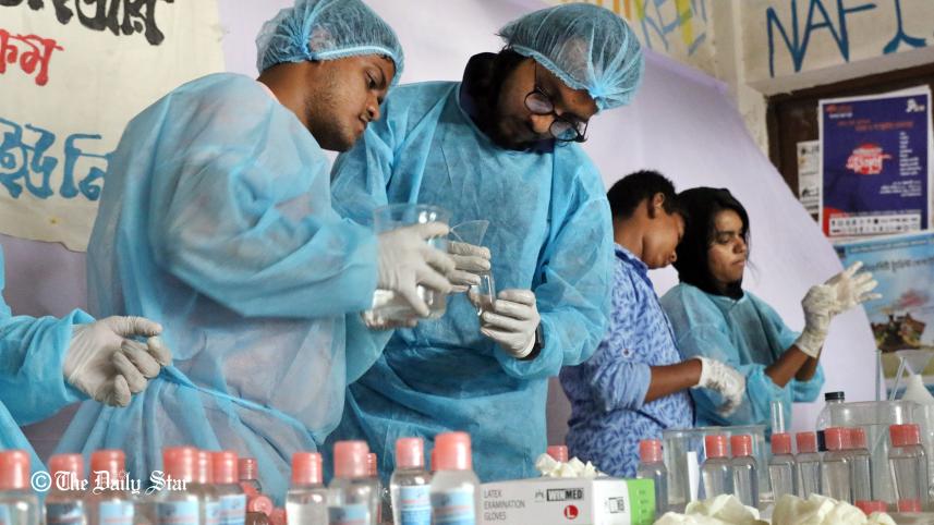 Chhatra Union activists filling bottles with hand sanitiser at a makeshift booth in Dhaka University’s TSC area on March 19, 2020. Activists of the student body distributed the germ killer, prepared by the university’s pharmacy department, among rickshaw pullers, hawkers and others for free on the campus throughout the day. Photo: STAR/ Prabir Das