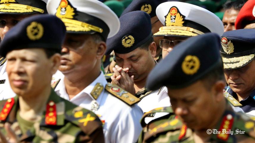 Armed forces officials offering prayers at the Banani Graveyard in the capital yesterday on the ninth anniversary of the BDR carnage. At least 57 army officers were killed in the mutiny in 2009. Photo: Anisur Rahman