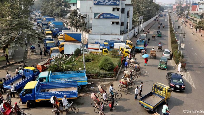 In this photo: Illegally parked trucks occupy over half of a street near Satrasta intersection in Tejgaon yesterday. Former mayor AnnisulHuq had removed an illegal truck stand from the adjacent road but the same thing appears to be making a comeback in his absence. Photo: Anisur Rahman
