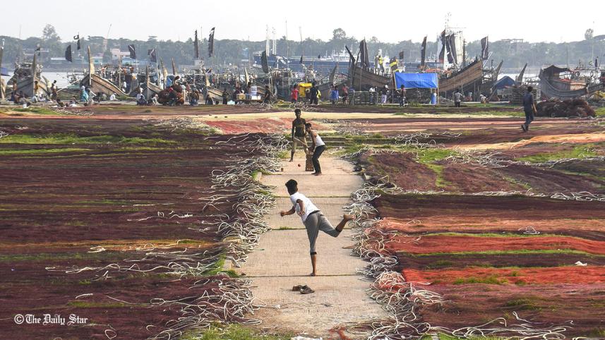 Three youths play a game of cricket in one of the few spots in a field not covered by fishing nets at Fisheryghat area in the port city. With the start of the 22-day ban on hilsa fishing, fishermen are using the empty field to dry their fishing nets before the new catching season begins. Photo: STAR/ Rajib Raihan