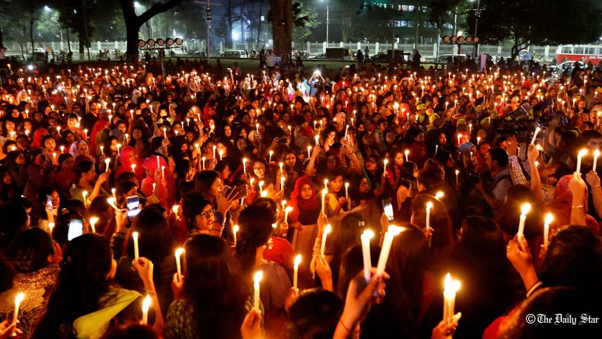 Women holding a candlelit vigil to mark the International Women’s Day. The event was organised by Dhaka University and a non-profit organisation called We Can Bangladesh at the Central Shaheed Minar last night. Photo: STAR/ Anisur Rahman