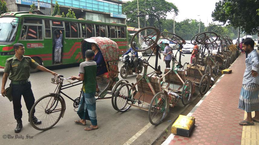 Rickshaws are tipped over and kept on the side of Mirpur Road near the Gono Bhaban. Police officers said they would impound the rickshaws as the pullers attempted to use the road prohibited to non-motorised vehicles. Photo: STAR/ Rashed Shumon