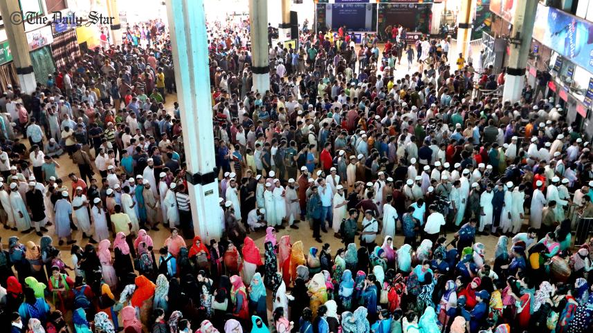 Thousands lined up at Kamalapur Railway Station as Bangladesh Railway started selling advance train tickets yesterday. PHOTO: STAR/ Prabir Das