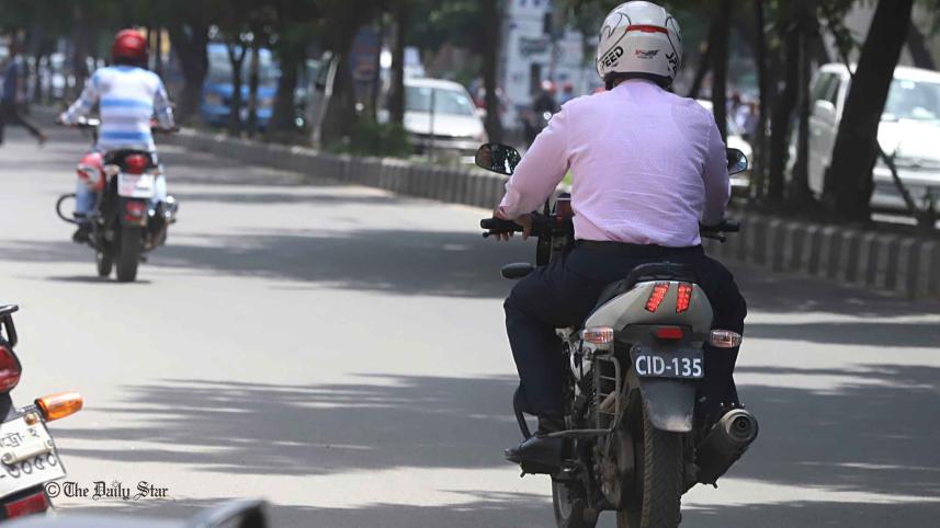 In this photo: Instead of having a number plate, this motorcycle plies a road in the capital's Tejgaon industrial area yesterday with a plate that reads “CID-135”. Photo: STAR/ Amran Hossain