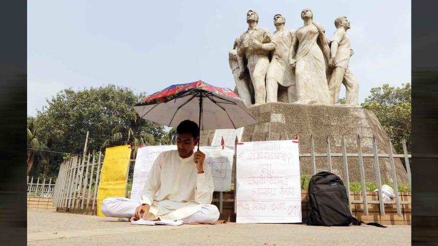 Akhtar Hossen, a third-year law student of Dhaka University, goes on hunger strike demanding the authorities again hold the “Gha” Unit admission test due to leak of question papers. He started observing the strike at the foot of Raju Memorial Sculpture on the university campus at 1:00pm yesterday, around two and a half hours before the publication of test results. Akhtar vowed to continue the strike until his demand was met. Photo: STAR/ Palash Khan