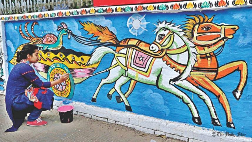 A student of the Faculty of Fine Arts at Dhaka University paints a mural on April 13, 2019 as part of the preparation for celebration of the Pahela Baishakh. Photo: STAR/ Anisur Rahman