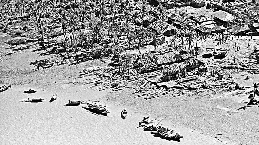 Hafiz rushed out of the cantonment, hiring a rickshaw to take him to the nearest river launch. From there, he caught a coal steamer to the port at Barisal. Shortly after they pulled out onto the river delta, the landscape started to change. Hafiz saw more and more bare palm trees with their fronds spilled across the ground and the battered thatched roofs of hundreds of shacks. But he still wasn't anywhere near the coast where the papers said that the storm's most violent winds thrashed the land. At Barisal, he caught a small ferry, which was currently the only vehicle able to navigate the narrow passages to Bhola. It was a four-hour journey.