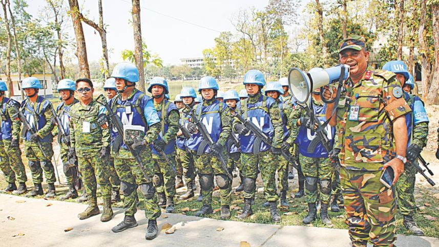 Anyone would think that there was a war going on in Bangladesh's Gazipur district. However, this was neither a war nor the shooting of a war movie in a real-world setting. Many of these soldiers were not even Bangladeshi. These soldiers from 29 different countries came to Bangladesh to receive training on UN peacekeeping missions. The Bangladesh Institute of Peace Support Operation Training (BIPSOT), with support from the US Pacific Command and Global Peace Operations Initiative (GPOI), has arranged Exercise Shanti Doot-4 to train 500 foreign and 650 Bangladeshi soldiers and officers about different aspects of UN peacekeeping missions. An all-female platoon from Bangladesh army also participated in this exercise. The two above-mentioned scenes were only a glimpse of their 15-day-long field training. For the training, the 56-acre campus of BIPSOT in Rajendrapur cantonment of Gazipur was converted into different real-life locations which UN peacekeepers face in various missions, particularly in the African countries.