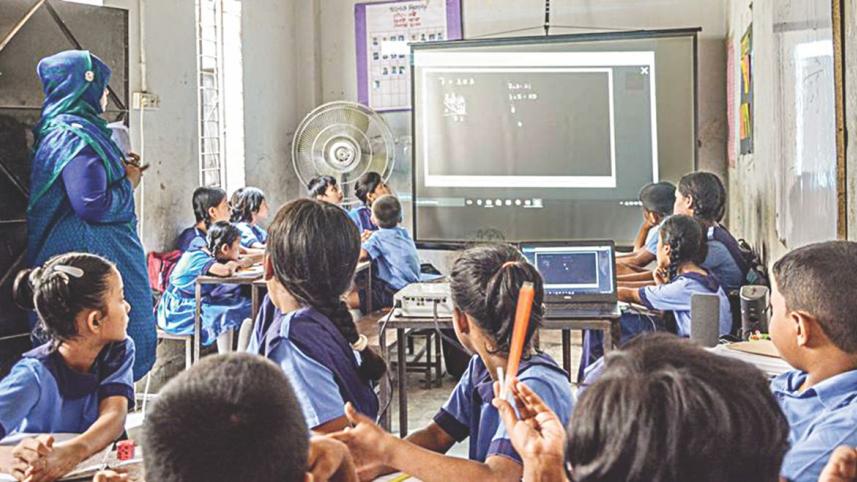 Looking up information on underprivileged children's education in Bangladesh, I found a picture online of a classroom that looked far from idyllic. The walls and floor were parched, with what was once white paint having been sullied to blotches of grimy yellow and grey. Rickety tables were covered in a copper palette of discoloured wood engraved with meaningless carvings. The corners of a lone white board looked brown and chewed out. Glowing through these depressing shades, however, were splashes of neon green and pink - in a garland of triangular post-it notes hung across the room; on bulletin boards scotch-taped onto the walls; and on numbers forming division and multiplication sums on a projector stationed in the front of the room. Learning from the lesson on the projector were groups of underprivileged young children clad in vivid blue.