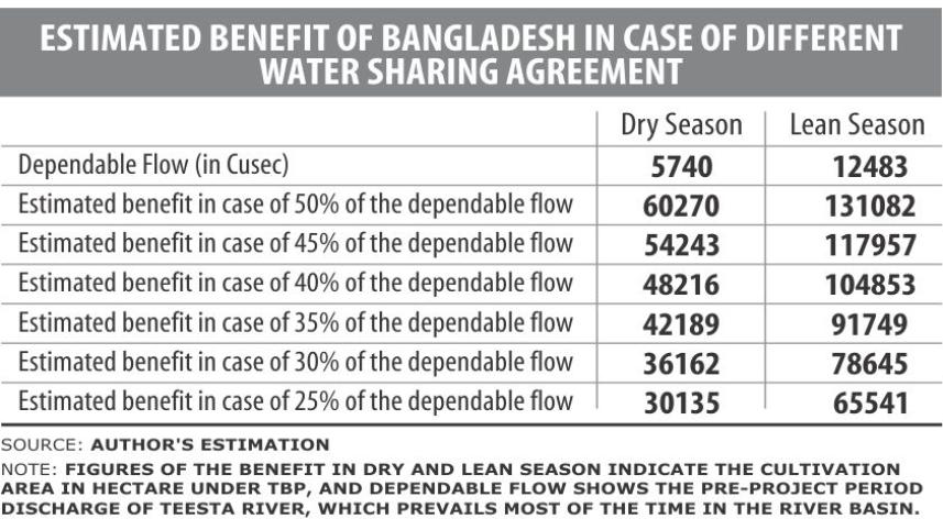 The Teesta agreement is required to sustain the relationship between India and Bangladesh and to ensure larger regional gains from this common river. It is important to evaluate the water discharge scenario of Teesta River and to provide a clear outline of Bangladesh's economic gains from different water sharing agreements. In Bangladesh the Teesta River is considered a solitary supplier of water resources in larger North-west region specifically, Rangpur, Lalmonirhat, Nilphamari, Dinajpur, and Kurigram districts and also branded as a prominent water supplier of Jamuna River.