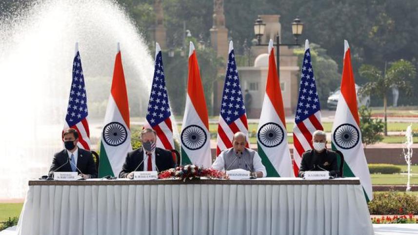 China loomed large over the in-person visit of US Secretary of State Mike Pompeo and Defence Secretary Mark T Esper to New Delhi on October 26-27. They held talks with their Indian counterparts S Jaishankar and Rajnath Singh in what has been institutionalised as a 2+2 format which began just two years ago with the backing of Prime Minister Narendra Modi and President Donald Trump.