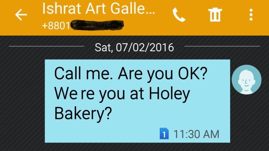 11:30 am, Saturday, July 2, 2016. After a sleepless night, I learn that Ishrat Akhond was at Holey Artisan Bakery. I immediately call her, only to find out that the phone is disconnected. And then my last SMS to her . . . It's all over by then.