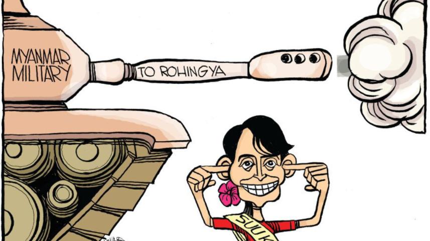 The State Counsellor also doesn't open her mouth on the atrocities in Rakhine. Did we really expect anything else a day after the speech of the military chief? Remember, 25 percent of Myanmar's parliament is reserved for the military. Thank Heavens that 25 percent of the members of the incumbent National League for Democracy are not reserved to receive military training. One thing is for sure, a hell of a lot more than 25 percent of the mind of the Myanmar's State Counsellor is made up on where she stands.