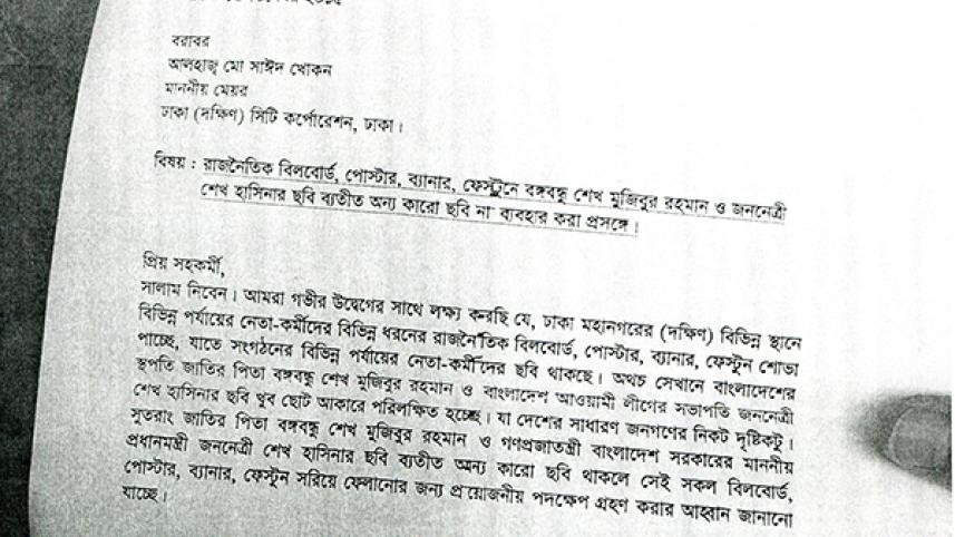 In the order to activists, Awami League told to withdraw such publicity materials, and to Dhaka city authorities, the party wrote to bring down such banners, festoons and posters.