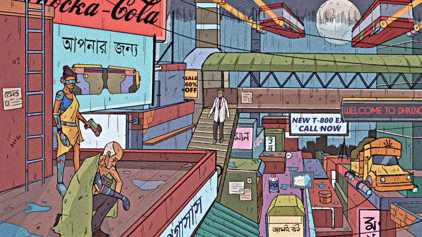 The light that drenched the man on the rooftop had no warmth to it. The light shifted and morphed with the changing visuals on the billboard, making the silhouette of his crouching body move around like a puppet on a string. The man was shivering. His rain-soaked cloak offered little to no comfort on this rainy evening in district DHK South.