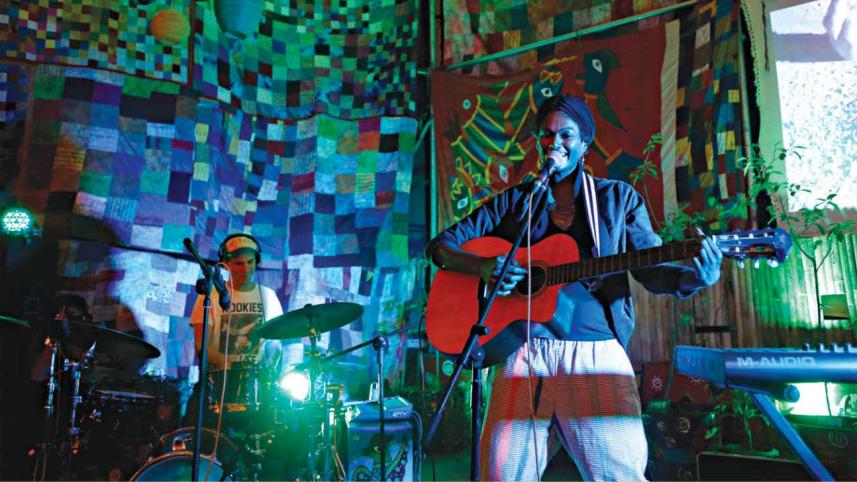 The concert started off with the first act, Chicken Soup, comprised of members Shoummo Saha and Humayun Islam. They performed their own rendition of the song “Rabbit in Your Headlights” – an innovative arrangement with futuristic sound loops and soft, digital melodies. Then, they moved on to original songs composed especially for the event. Chicken Soup's music felt like a collision between space-age and retro sounds, interspersed with groovy beats. As the evening progressed, their music became quite catchy, and got the crowd swaying to the rhythm.