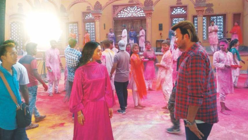 Shooting for the film Shahenshah recently took place at FDC. Fans of Shakib Khan gathered outside the place to get a glimpse of their beloved hero. He was there to shoot a scene where he met Nusraat Faria's onscreen character, Layla for the first time. Set extras were instructed to play with colors on the set. Shakib Khan was in full costume, with a side of his face covered in color. When Shakib Khan and Nusraat Faria faced each other on set, they looked at each other with admiration, as per direction. With the camera rolling, Nusraat made her way out of the scene, and Shakib kept looking at her. Director Shamim Ahmed Roni said about this scene, “Shakib Khan's Shahenshah came to visit the Boro Nawab in this scene. When he was making his way out, he saw the Boro Nawab's daughter in the festival of colors. He immediately took a liking to her.” After shooting, directors Mushfiqur Rahman Gulzar, Badiul Alam Khokon and Shahin Kabir Tutul came to visit Shakib Khan. Throughout the entire day Shakib Khan kept on saying, “Someone from the film fraternity should stand for the parliament elections. That person can tell the parliament about our sufferings. Whoever it is, I will support them. If people from other places can contest in elections, why can't we do it as well?” Before evening, Shakib Khan removed his makeup, and headed to Pan Pacific Sonargaon Dhaka Hotel for a meeting.