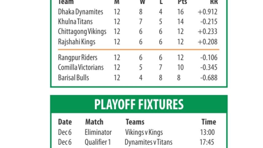 Reigning champions Comilla Victorians ended their Bangladesh Premier League campaign with an eight-run win over the Rangpur Riders at Mirpur yesterday and in the process helped the Rajshahi Kings book a place in the play-offs.