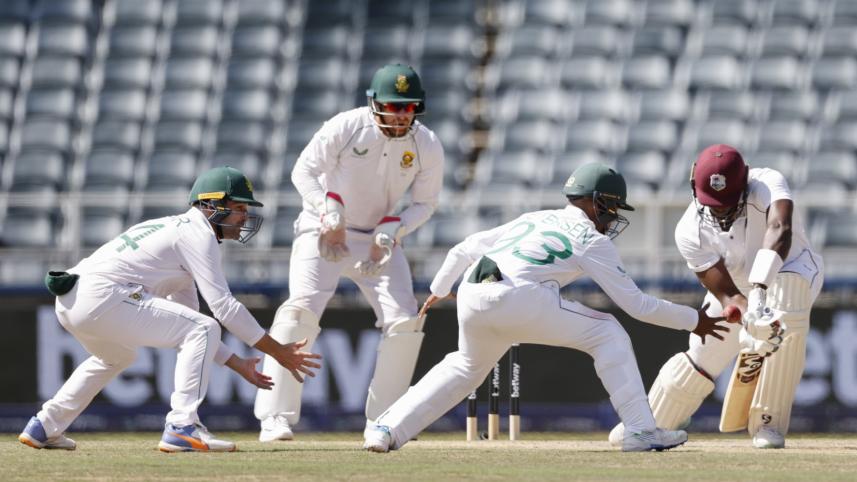 Gerald Coetzee, playing in his second Test, took three for 41 and fellow fast bowler Kagiso Rabada took two for 19. Rabada only sent down 12 overs and did not bowl after tea.