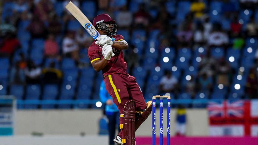 His innings included five fours and eight huge sixes after dominating an opening stand of 118 with Brandon King (30).
