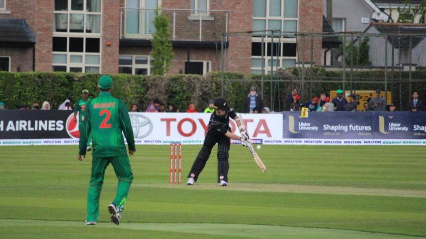 Opener Luke Ronchi fell for a slower delivery from Mustafizur and was caught at mid-off by Mahmudullah after scoring a run-a-ball 27, hitting four fours and a six. Tom Latham is at the other end on 12 runs from 15 balls.