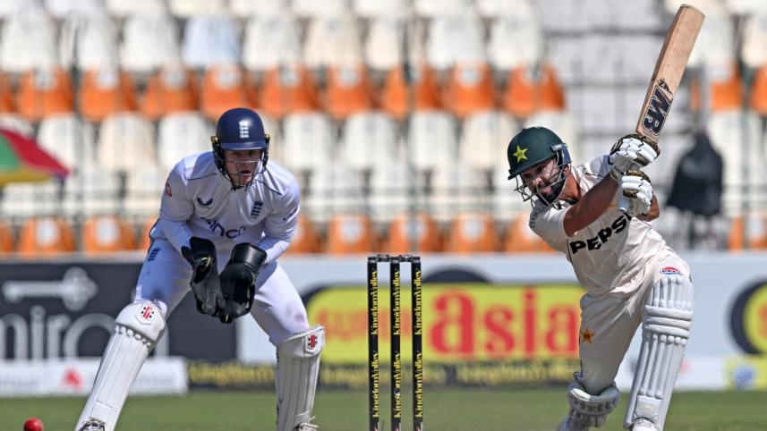 Abdullah Shafique was bowled by Leach for seven in the eighth over of the morning with the score on 15.