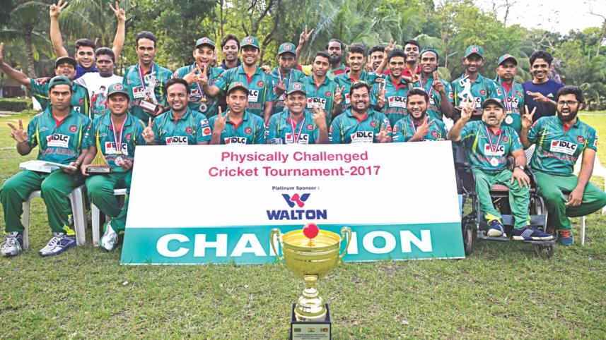 Bangladesh celebrate with the trophy of the Physically Challenged Tri-Nation Series 2017 at the Jagannath Hall grounds after the final against India was called off yesterday. The teams were declared joint champions. Photo: Star