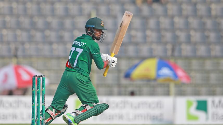 Earlier, Hridoy brought up his maiden ODI fifty by hitting five fours in 55 balls.