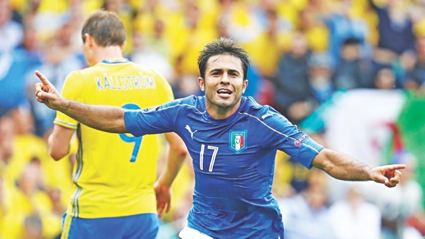 But the Inter Milan striker had the Italy bench celebrating wildly on the pitch at the Stadium de Toulouse with a well-taken 88th minute strike after running on to Simone Zaza's header to beat Andreas Eriksson at his far post.