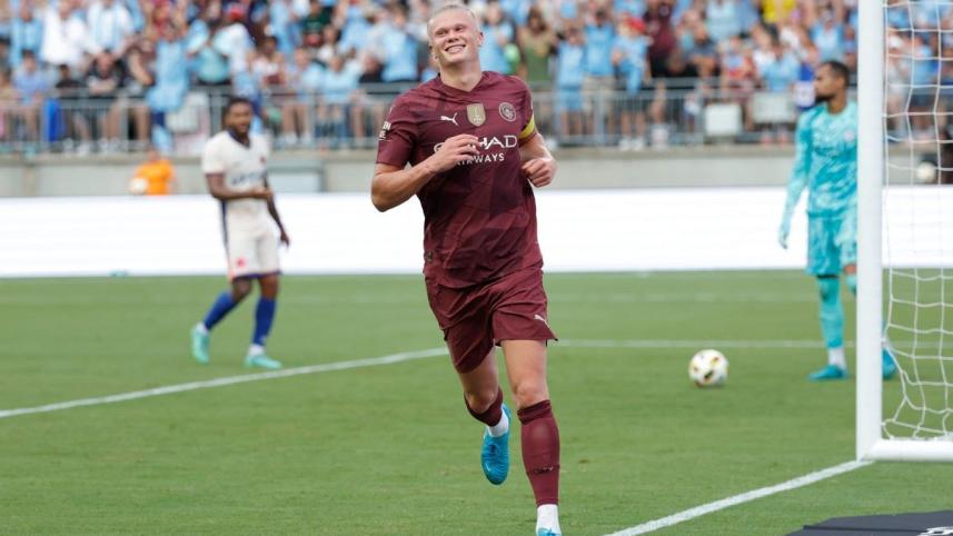 Erling Haaland's hat trick, including two goals in the first five minutes, led Manchester City over Chelsea 4-2 on Saturday in an English club football friendly at Columbus, Ohio.