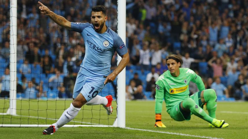 On a night of goals, Sergio Aguero hit a hat-trick as Manchester City hammered Borussia Moenchengladbach 4-0 at home in a fixture which took place 24 hours late after rain forced the game off on Tuesday, while a rampant Borussia Dortmund smashed Legia Warsaw for six.