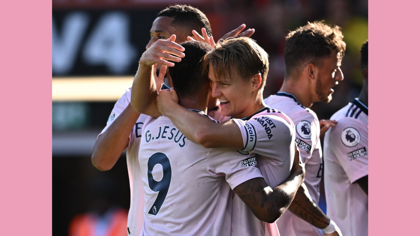 Martin Odegaard scored twice in the opening 11 minutes as Arsenal outclassed newly-promoted Bournemouth for a 3-0 victory to move top of the Premier League on Saturday.