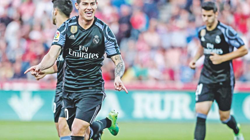 Alvaro Morata and James Rodriguez scored twice as a much-changed Real Madrid moved to within three victories of winning La Liga with a 4-0 demolition of Tony Adams's already-relegated Granada.