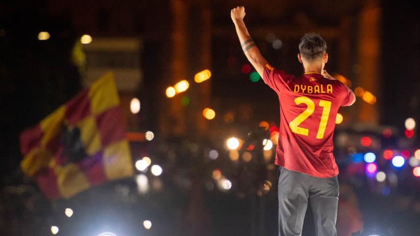 Dybala looked moved by the spine-tingling sound created by the fans who waved club flags in celebration at the Square Colosseum lit with Roma's club colours.