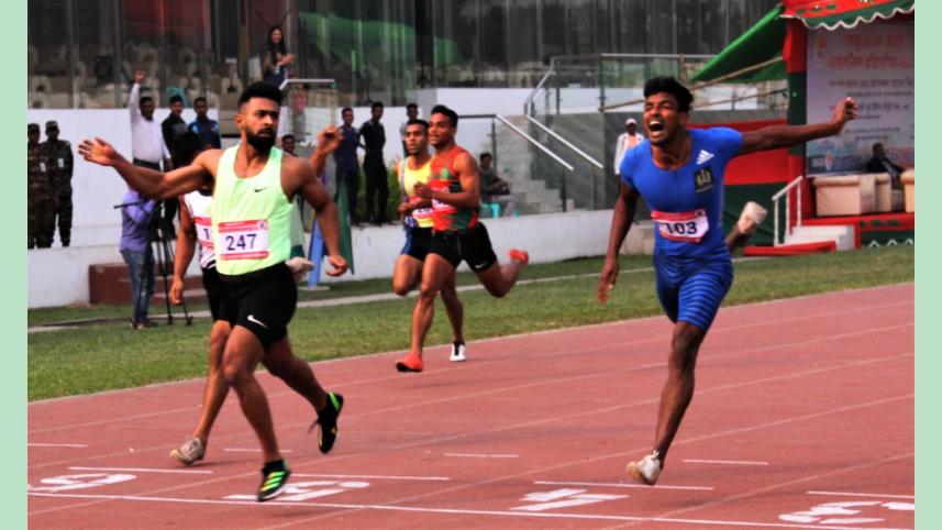 Imranur of Bangladesh Army, the winner in the 100m, took 21.41 seconds to win the 200m dash. Sumaiya of the same team won the women's 200m dash at 25.30 seconds (hand timing).
