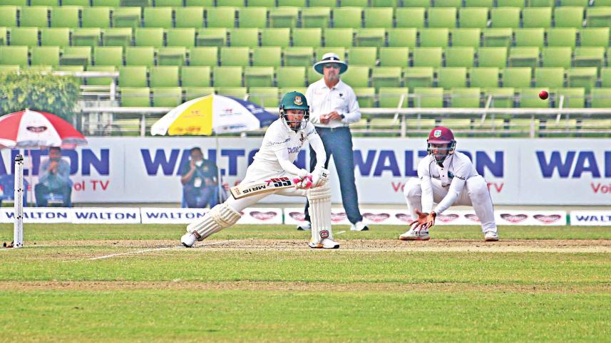 Both overnight batsmen -- Mohammad Mithun and Mushfiqur Rahim -- managed to negotiate a barrage of bouncers from Shannon Gabriel for the first 30 minutes. But just when the pair looked settled enough to put on a big partnership, Mithun mistimed a flick off Cornwall to short mid-wicket after facing 86 ball for 15 runs, ending the fifth-wicket stand at 72.