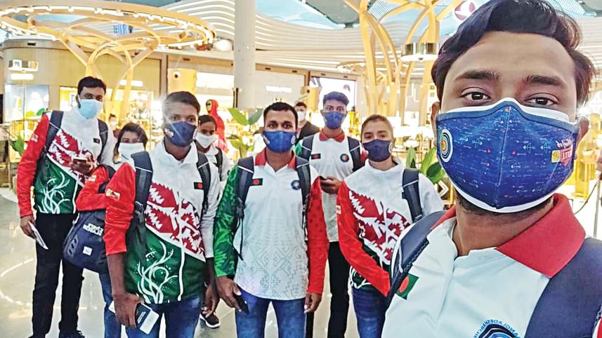 Bangladesh’s top archer Ruman Sana takes a selfie with his teammates at the Istanbul Airport yesterday, en route to Switzerland where they will take